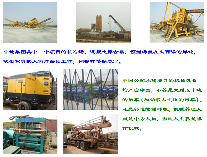 中地集團其中一個項目的軋石場、混凝土拌合樓、預制場就在大西洋的岸邊,吹著涼爽的大西洋海風工作,別提有多愜意了。中國公司承建項目的機械設(shè)備均產(chǎn)自中國,不管是大到五十噸的吊車(加納最大噸位的吊車),還是普通的制磚機。機械管理人員是中方人員,當?shù)厝酥饕遣僮鳈C械。