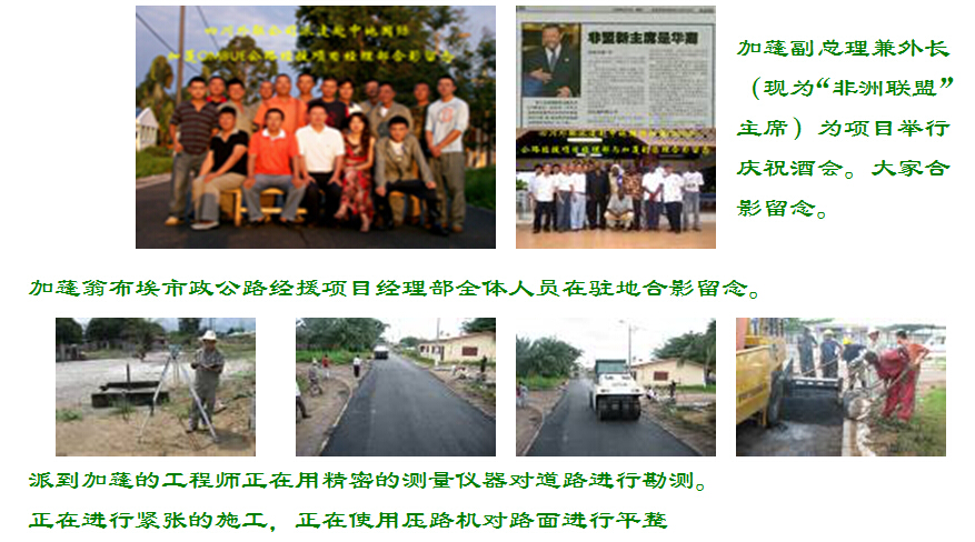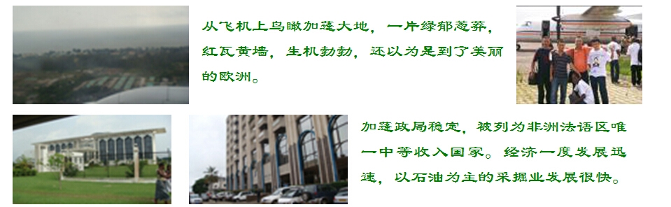 從飛機(jī)上鳥瞰加蓬大地,一片綠郁蔥莽,紅瓦黃墻,生機(jī)勃勃,還以為是到了美麗的歐洲。加蓬政局穩(wěn)定,被列為非洲法語(yǔ)區(qū)唯一中等收入國(guó)家。經(jīng)濟(jì)一度發(fā)展迅速,以石油為主的采掘業(yè)發(fā)展很快。加蓬年平均氣溫26℃,擁有豐富的森林資源,森林面積占全國(guó)土地面積的85%,被譽(yù)為非洲的“綠金之國(guó)”。加蓬的氣候很適宜植物的生長(zhǎng),美麗的出產(chǎn)的蔬菜瓜果品種繁多,真稱得上花朵,絢麗而多姿。加蓬副總理兼外長(zhǎng)(現(xiàn)為“非洲聯(lián)盟”主席)為項(xiàng)目舉行慶祝酒會(huì)。大家合影留念。加蓬翁布埃市政公路經(jīng)援項(xiàng)目經(jīng)理部全體人員在駐地合影留念。派到加蓬的工程師正在用精密的測(cè)量?jī)x器對(duì)道路進(jìn)行勘測(cè)。正在進(jìn)行緊張的施工,正在使用壓路機(jī)對(duì)路面進(jìn)行平整站在自己修建的馬路上,別有一翻滋味在海邊一處施工工地現(xiàn)場(chǎng)。
