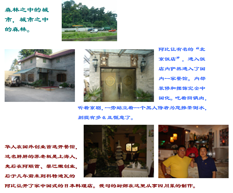 阿比讓有名的“北京飯店”,進(jìn)入飯店內(nèi)儼然進(jìn)入了國(guó)內(nèi)一家餐館。內(nèi)部裝修和擺飾完全中國(guó)化。吃著回鍋肉,聽著京劇,一旁站立著一個(gè)黑人侍者為您摻茶倒水,別提有多么且愜意了。華人在國(guó)外創(chuàng)業(yè)首選開餐館,這名胖胖的蘇老板是上海人,先后在阿聯(lián)酋、黎巴嫩創(chuàng)業(yè),后于幾年前來(lái)到科特迪瓦的阿比讓開了家中國(guó)式的日本料理店。我司的廚師在這里從事四川菜的制作。