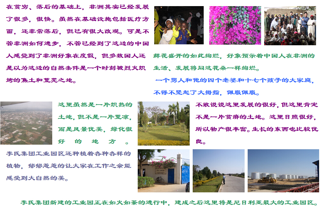 尼日利亞官方語言是英語,工業(yè)主要靠國外投資,比如:英國、美國、臺灣和中國華僑,集團在尼日利亞有較高的聲譽,和尼日利亞政府關系較好,彼此有較好的合作。